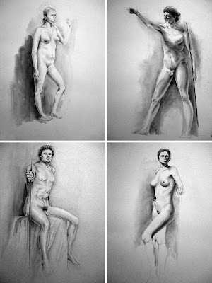 Cada desenho compreendeu uma pose de 6 horas, sendo que os primeiros 30 minutos foram para criar a estrutura, para só posteriormente se modelar a forma. Os desenhos a carvão ditos académicos podiam demorar certa de 13 horas!!!!